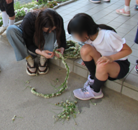 やっしーの紙芝居 「シロツメクサの花冠 つくったよー」「長くできたやろ~」 「花冠・・・・」 「何メートルか はかってー」