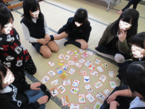 紙芝居(5年生チーム) おいしいよ農園カルタ ぜんざい 豆つまみ コマ回し 羽子板 くじびき(6年生