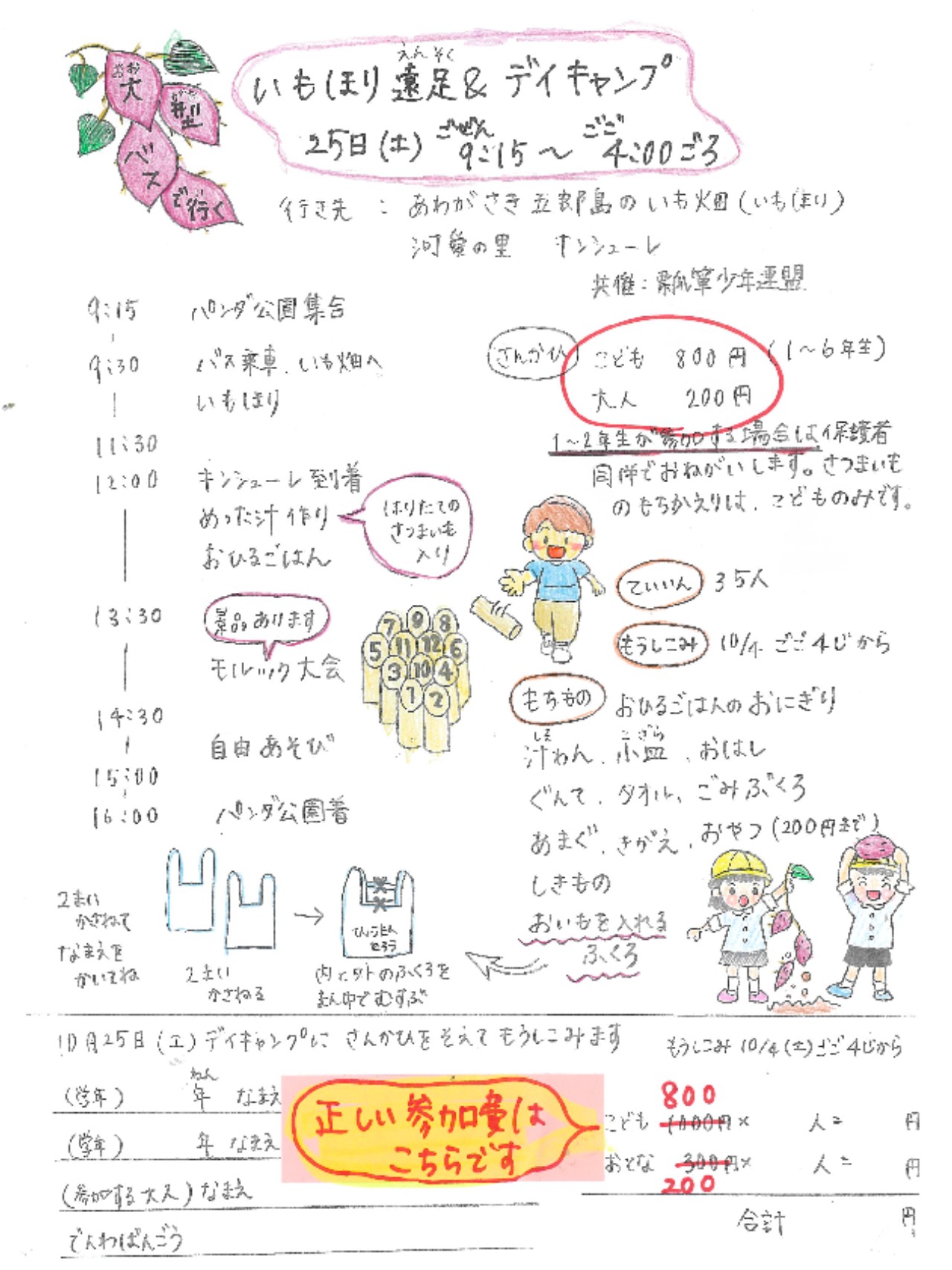 いもほり遠足&ディキャンプ参加費の記載に誤りがありました。 誤:こども1.000円→正:こども800円 誤:おとな300円→正:おとな200円