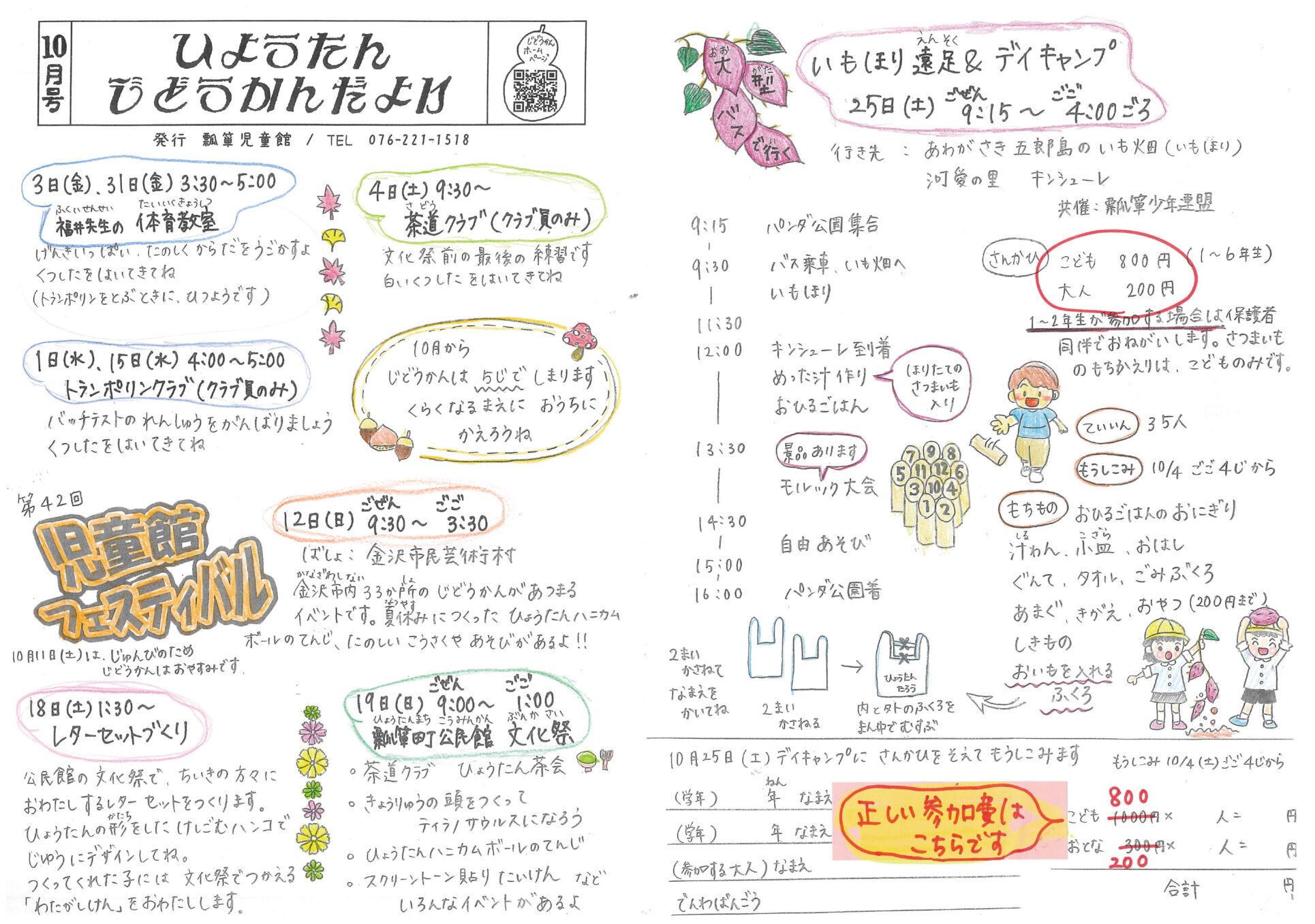 2025.09.24じどうかんだより 2025年10月 児童館だより いもほり遠足&ディキャンプ参加費の記載に誤りがありました。 誤:こども1.000円→正:こども800円 誤:おとな300円→正:おとな200円