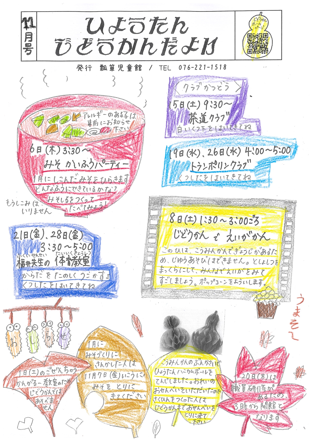11月20日(木)は職員けんしゅうがあるため、3時からの開館となります。