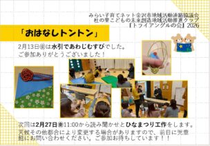 2月27日(金)もりのさとひろば「おはなしトントン」があります🎵 ひなまつり工作です。たくさんの参加