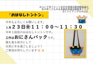 今月のもりのさとひろばは、水引を変更して、「おにさんバック」作りをします🎵 寒い中ですが、元気に遊ん 続きを読む...