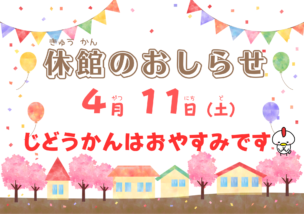 明日、4月11日(土)は休館となります。 児童館では遊べません。 よろしくお願いいたし